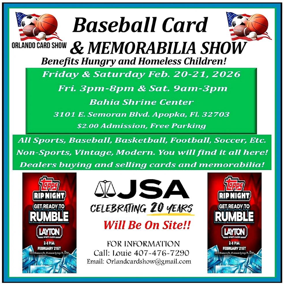 The Orlando Card Show is back on February 20-21, 2026 at the Bahia Shrine Hall in Apopka. The show runs Friday 3:00 PM to 8:00 PM and Saturday 9:00 AM to 3:00 PM at 3101 E Semoran Blvd, Apopka, FL 32703. Admission is two bucks and parking is free.